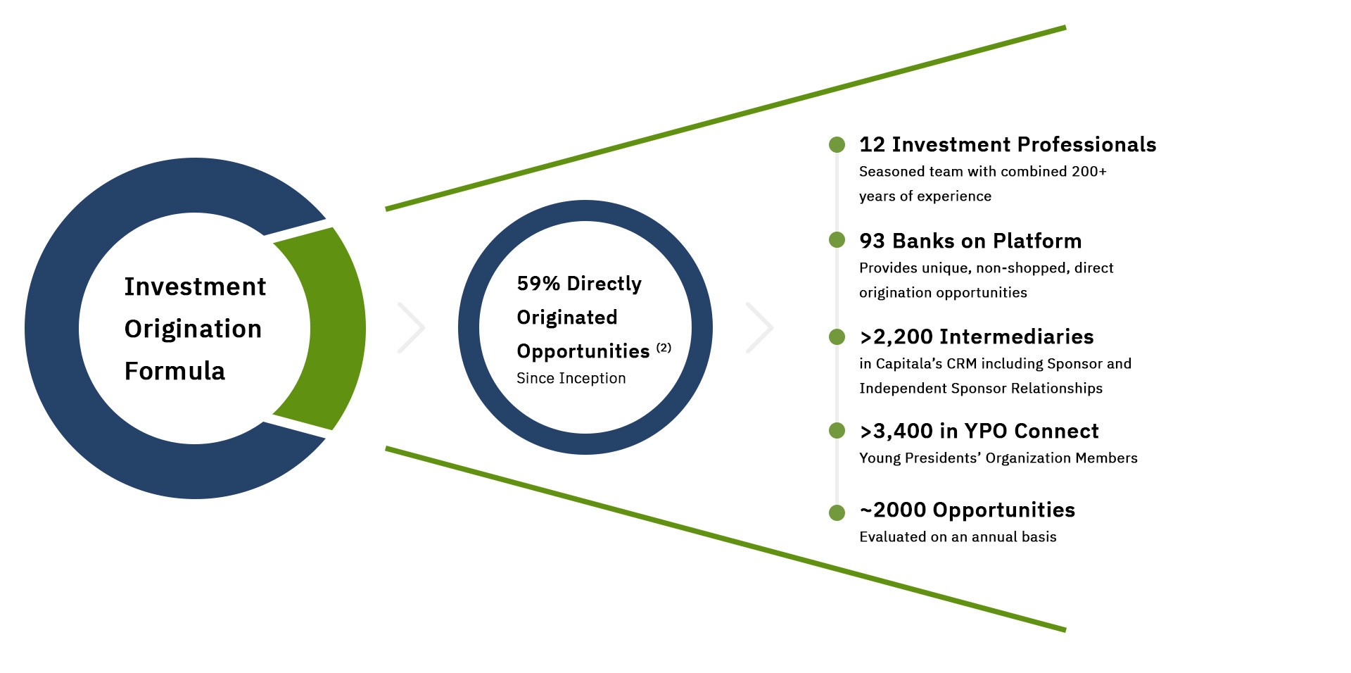 Capitala leverages a diverse network of resources, including bank investors, sponsor and non-sponsor relationships, and industry experts, to enhance our deal flow and investment strategy. These strategic partnerships provide deep sector knowledge, valuable market insights, and extensive networks that help us identify, evaluate, and execute high-quality investment opportunities. By tapping into these resources, we strengthen our ability to navigate complex market dynamics, uncover emerging trends, and deliver long-term value to our portfolio companies and investors.